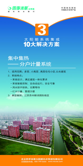三.集中集热——分户计量系统 1.适用范围:多层、小高层、高层住宅小区,公共建筑 2.系统特点: ►系统设计,满足建筑一体化要求 ►系统智能控制、全自动运行,安全可靠 ►用水即开即热,无需等待 ►IC卡计量,管理方便 3.典型案例:江苏苏州朗诗国际街区