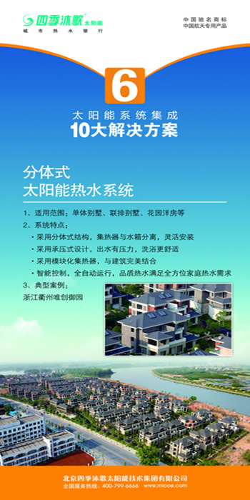 六.分体式太阳能热水系统 1.适用范围:单体别墅、联排别墅、花园洋房等 2.系统特点: ►采用分体式结构,集体热与水箱分离,灵活安装 ►采用承压式设计,出水有压力,洗浴更舒适 ►采用模块化集热器,与建筑完美结合 ►智能控制,全自动运行,品质热水满足全方位家庭热水需求 3.典型案例:浙江衢州唯创御园